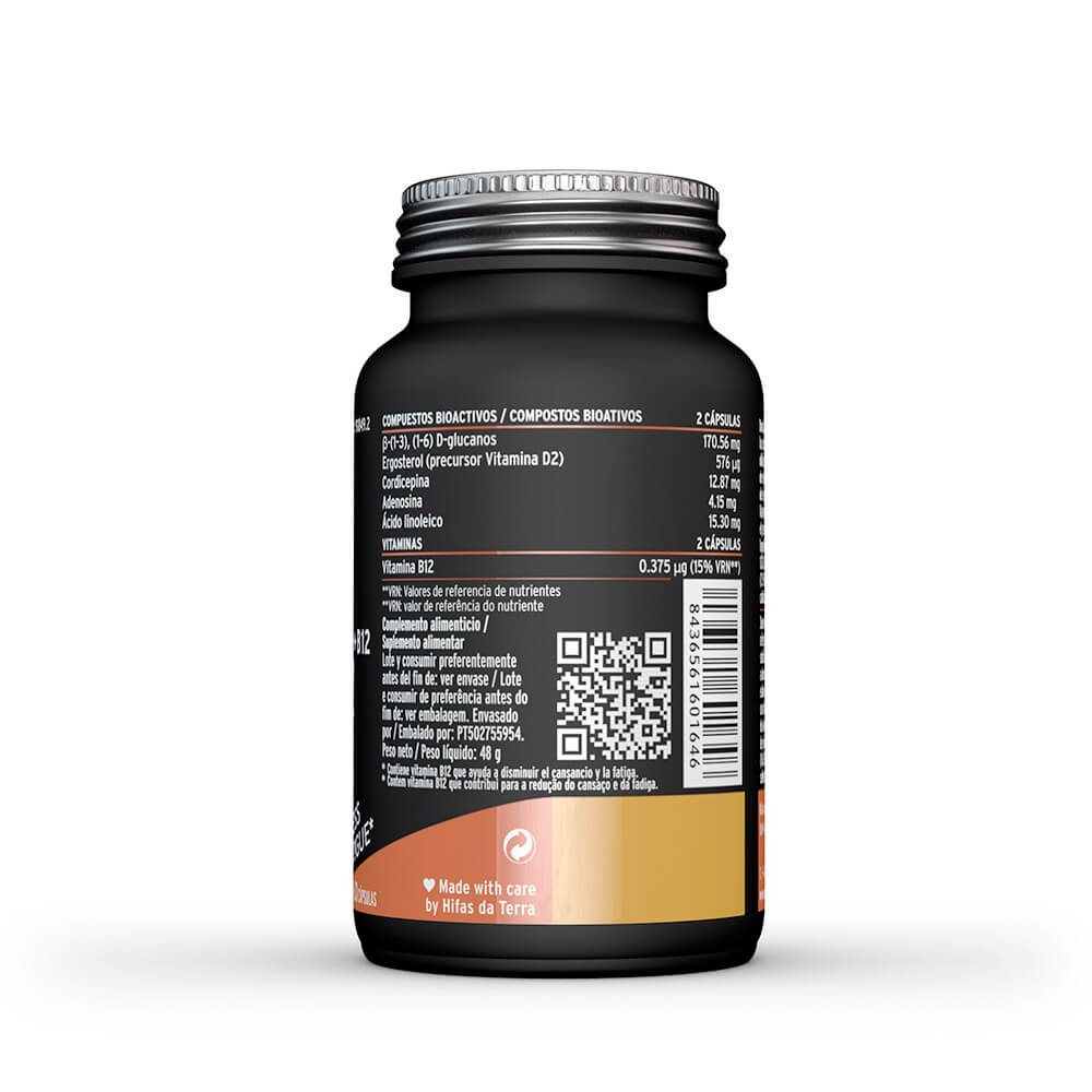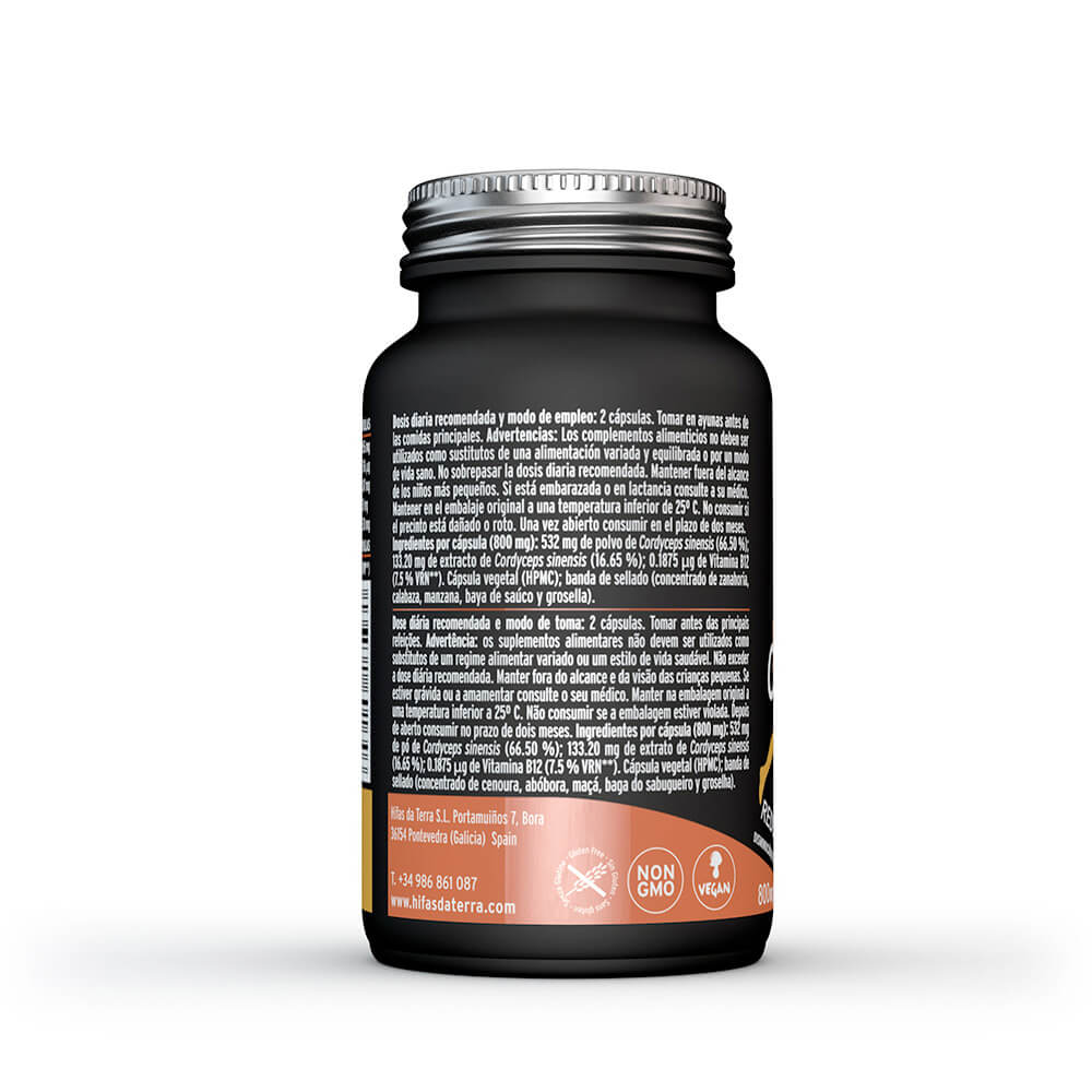 532 mg de polvo micronizado de seta de producción ecológica certificada y 133.2 mg de extracto puro ecológico estandarizado de Cordyceps sinensis.