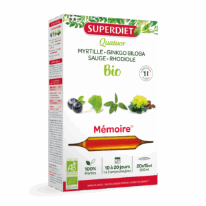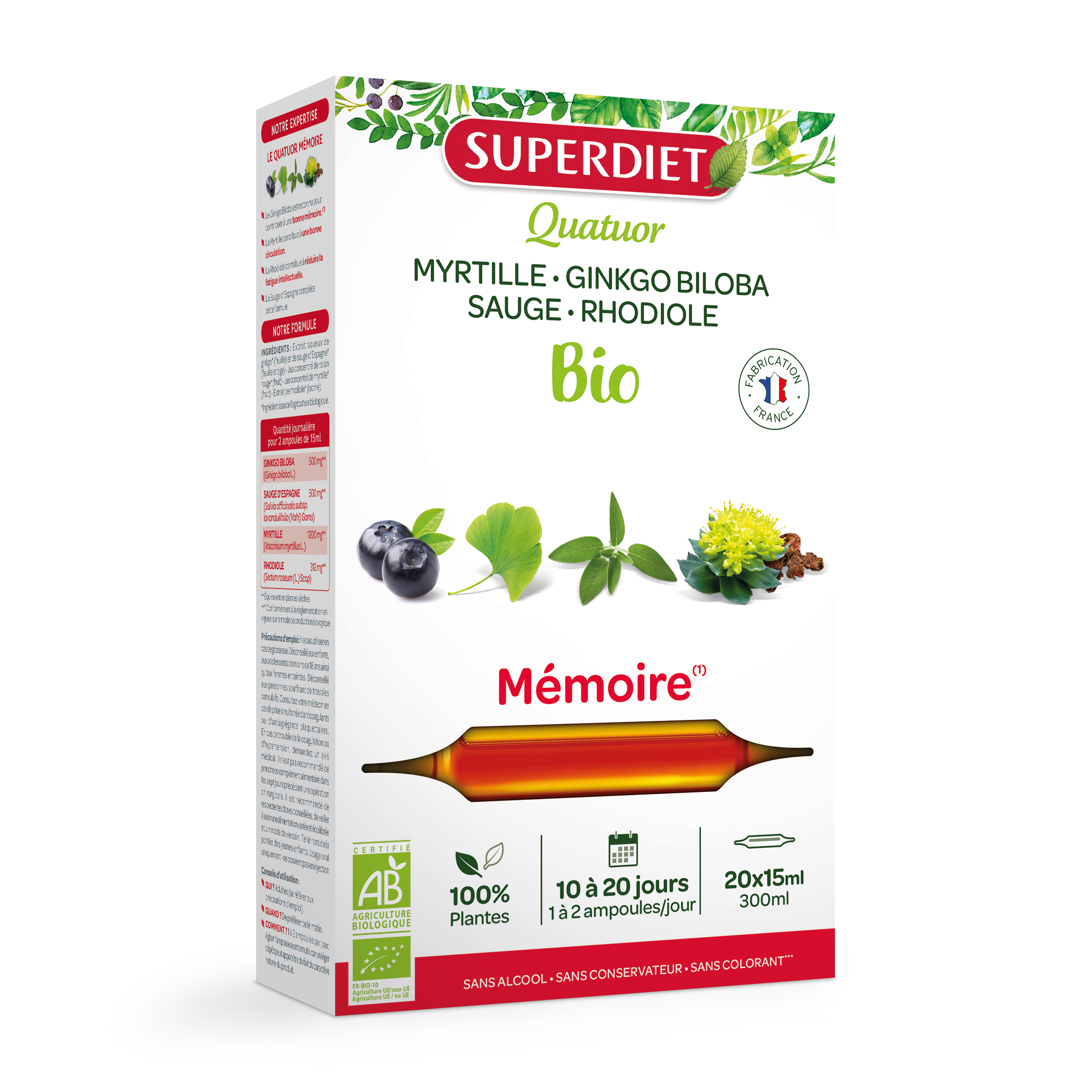 Extracto acuoso de Ginkgo* (Ginkgo Biloba – hojas) (500 mg**), Arándano Negro*(Vaccinium Myrtillus L.-fruto) (1200 mg**), y Salvia de España (Salvia Lavandulifolia – hojas) (500 mg**), Zumo concentrado de Uvas rojas (Vitis Vinifera – fruta) (4,5 ml***). Extractos secos de Rhodiola (Rodhiola rosea – raíz) (1 000 mg**).