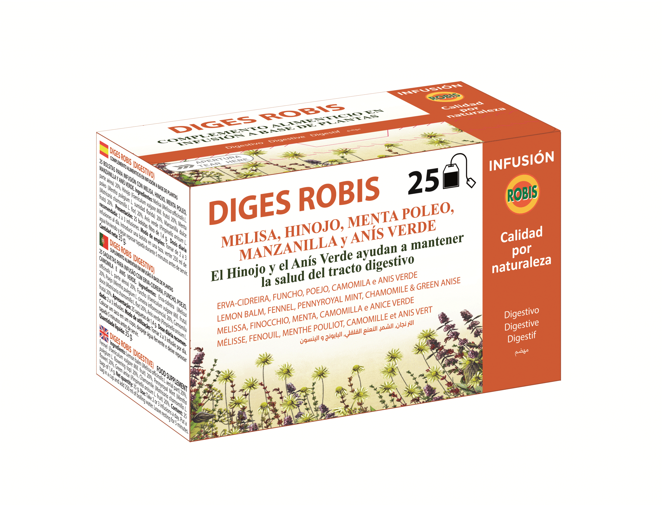Melisa corte infusión (Melissa officinalis L. parte aérea) 20%, Hinojo corte infusión (Foeniculum vulgare Mill. fruto) 20%, Menta poleo corte infusión (Mentha pulegium L. sumidad florida) 20%, Manzanilla dulce corte infusión (Matricaria chamomilla L. flor) 20%, Anís verde corte infusión (Pimpinella anisum L. fruto) 20%.