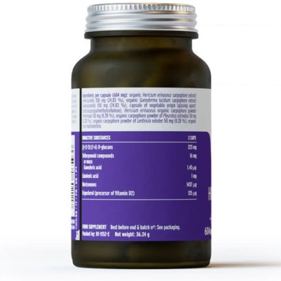 Sinergia de hongos medicinales prebióticos y reguladores de la microbiota autóctona (Reishi, Melena de León, Pleurotus, Shiitake) útil para todo tipo de alteraciones de la microbiota, tanto en disbiosis intestinal, SIBO, SIFO (candidiasis intestinal) y como preventivo en el cuidado del equilibrio de la microbiota vaginal, piel y de mucosas.