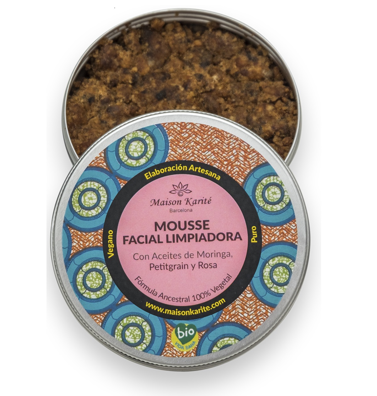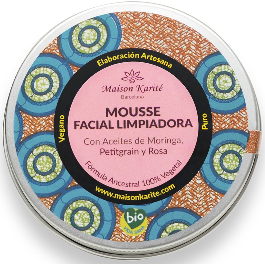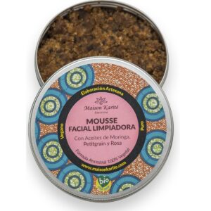 Mousse limpiadora de uso diario con aceite de Moringa Salvaje, Petitgrain de Azahar, polvo de Rosa Damascena y una base de Jabón Negro Africano elaborado a mano sin químicos y saponificado con ceniza con técnicas milenarias.