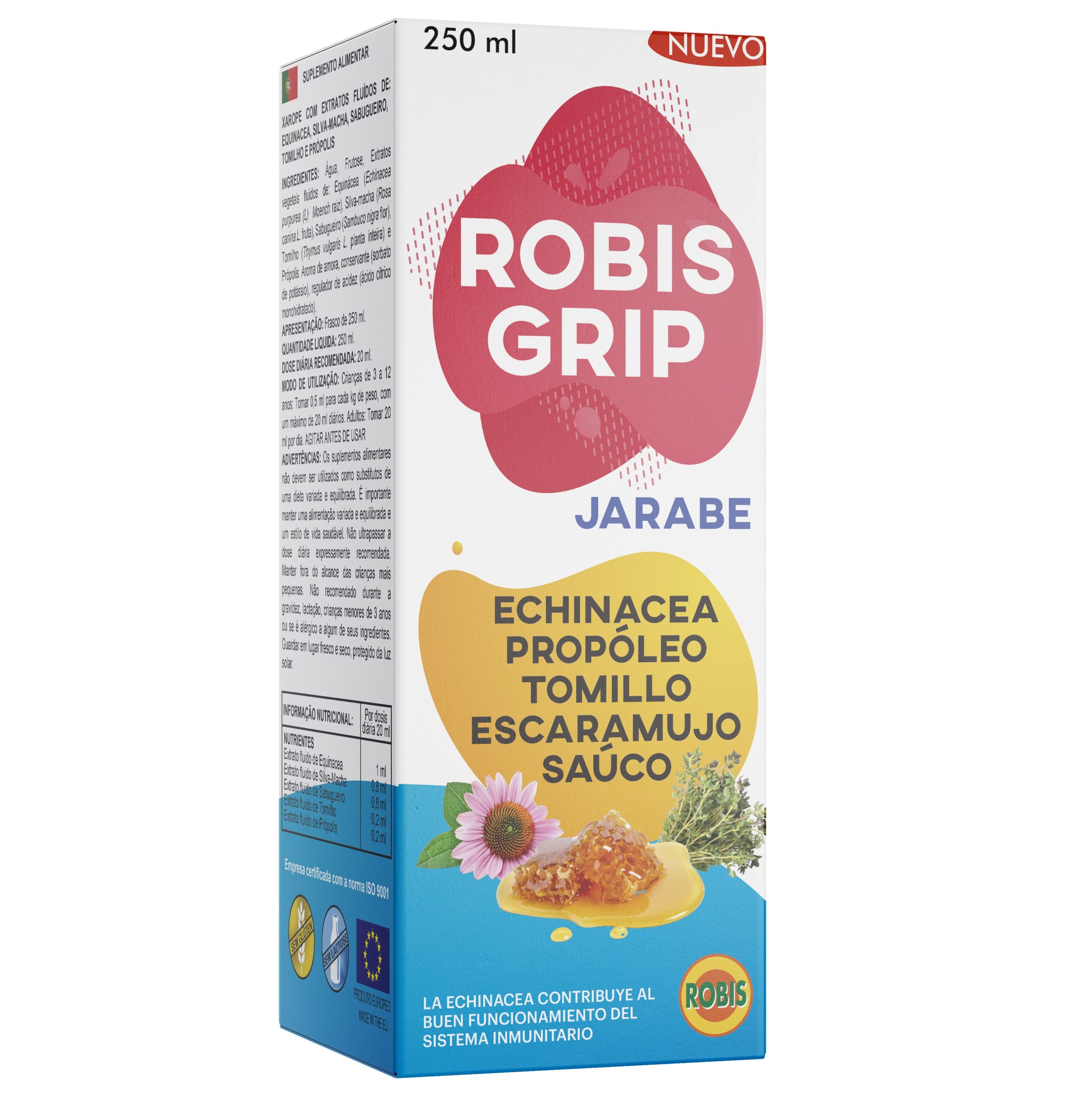 Extractos vegetales fluidos de: Equinácea (Echinacea purpurea (L) Moench raíz), Escaramujo (Rosa canina L. fruto), Saúco (Sambucus nigra L. flor), Tomillo (Thymus vulgaris L. planta entera) y Propóleo. Aroma de Mora, conservador (sorbato potásico), corrector de la acidez (ácido cítrico monohidratado).